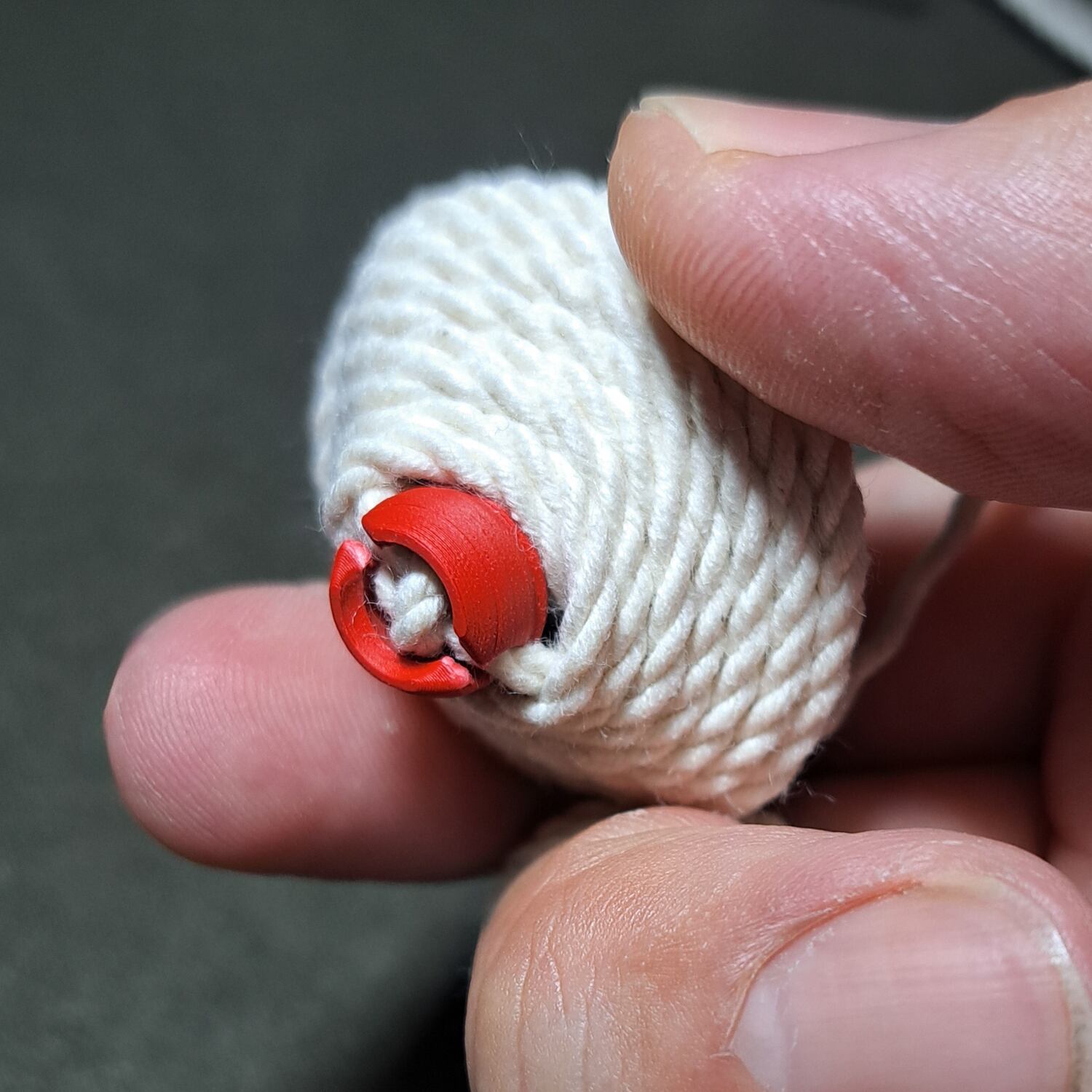 ベーゴマの先端に取り付けることで、ひもを巻く際のズレを防ぎます。このキャップをひもに装着することで、ひもがとても巻きやすくなり、初心者でもスムーズにベーゴマを扱えるようになります。
